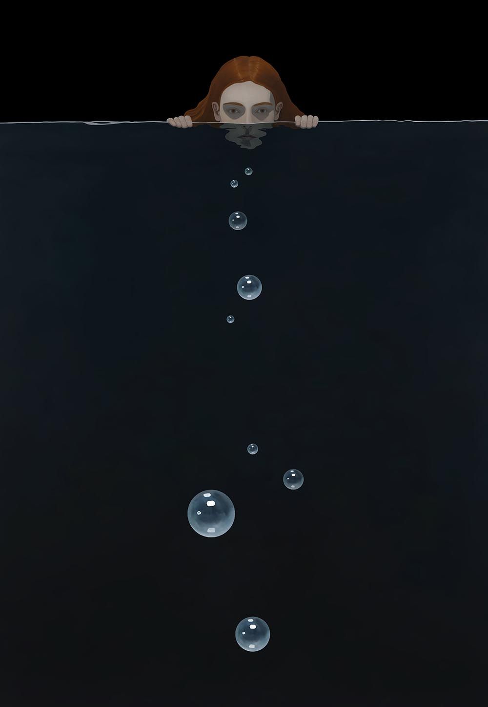 A couple sits quietly in a bathtub, adrift on still Arctic waters beneath a glowing full moon. Icebergs rise in the distance like frozen monuments, their reflections perfectly mirrored on the glassy surface. The bath — a symbol of warmth and intimacy — becomes a vessel through the vast and silent expanse.