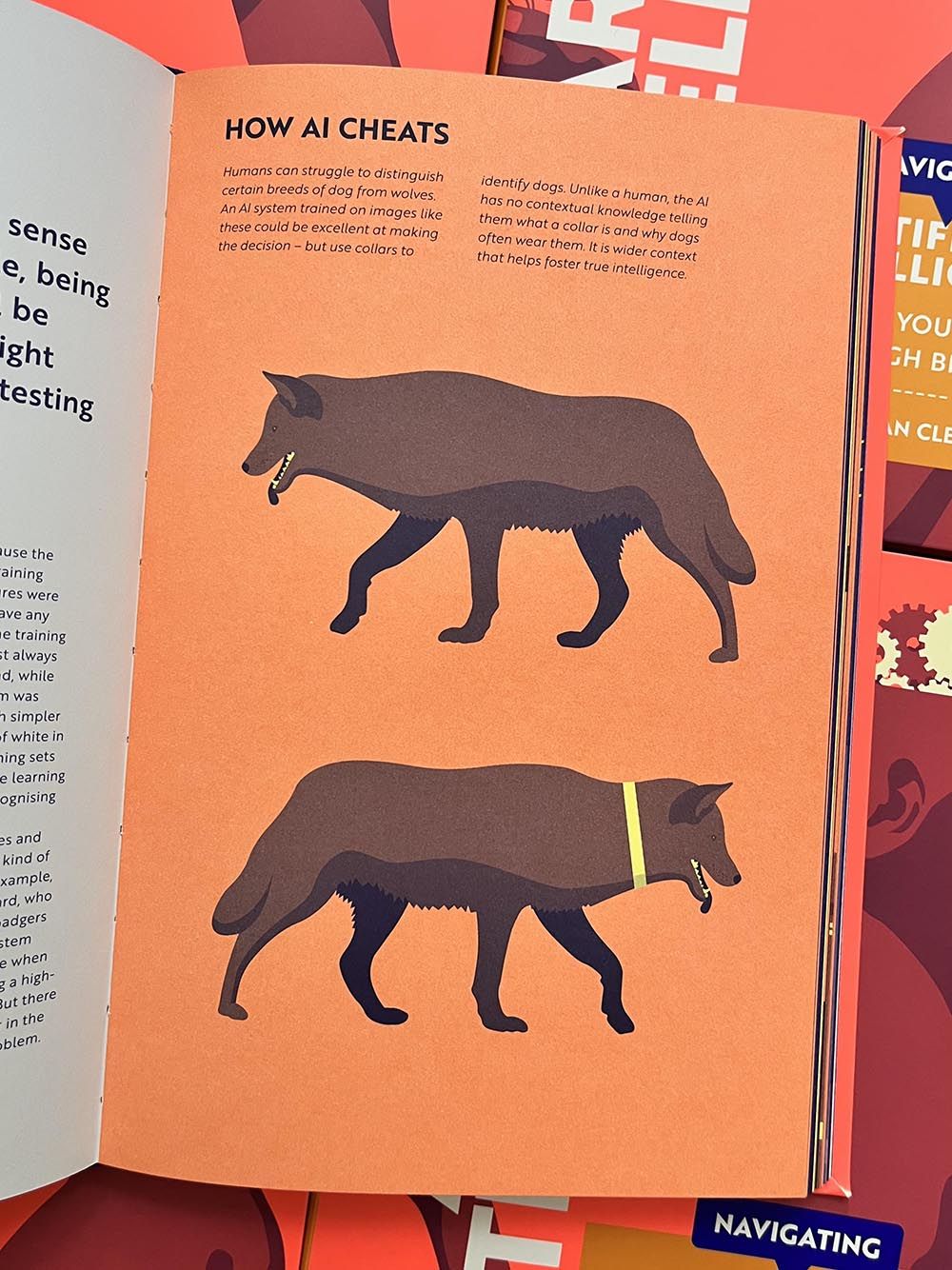 The illustrations were produced using a restrained palette of three spot colours – blue, magenta, and yellow. The publisher subsequently replaced magenta with peach. Through layering and transparency, the illustrations convey both clarity and conceptual nuance, inviting readers to explore AI’s complexities visually.